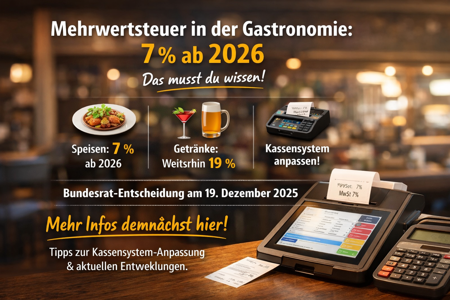 Die dauerhafte Mehrwertsteuersenkung auf 7 % für Speisen ab 2026 ist für viele Gastronomen eine wichtige Entlastung. Nutze die Zeit bis Jahresende, um deine Preise, Kassensysteme und Kommunikation entsprechend vorzubereiten. Sobald der Bundesrat zustimmt, kannst du die neue Regelung von Anfang an korrekt umsetzen.