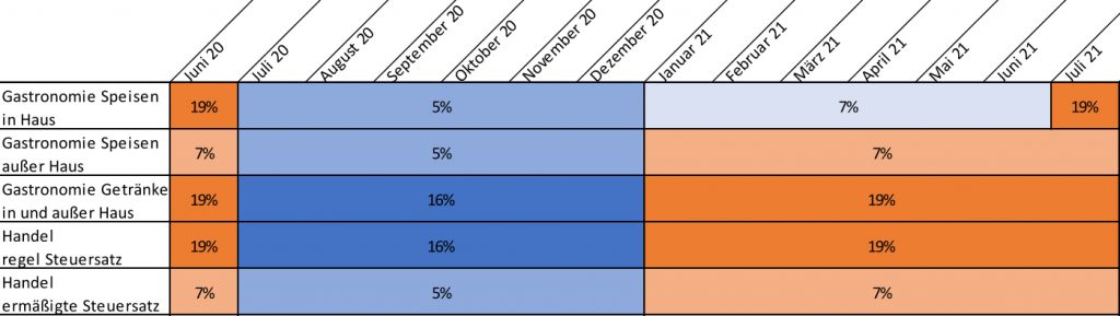 Die Bundesregierung hat im Konjunktur Paket zur Corona Krise am 22.04.2020 beschlossen die Gastronomen über eine Umsatzsteuer Änderung zu entlasten *1. Es wurde beschlossen, das vom 01.07.2020 bis 31.06.2021 Speisen die im Haus verzehrt werden nicht mehr der regel Steuersatz, sondern der ermäßigte Steuersatz zur Anwendung kommt. Getränke sind von diese Änderung nicht betroffen.